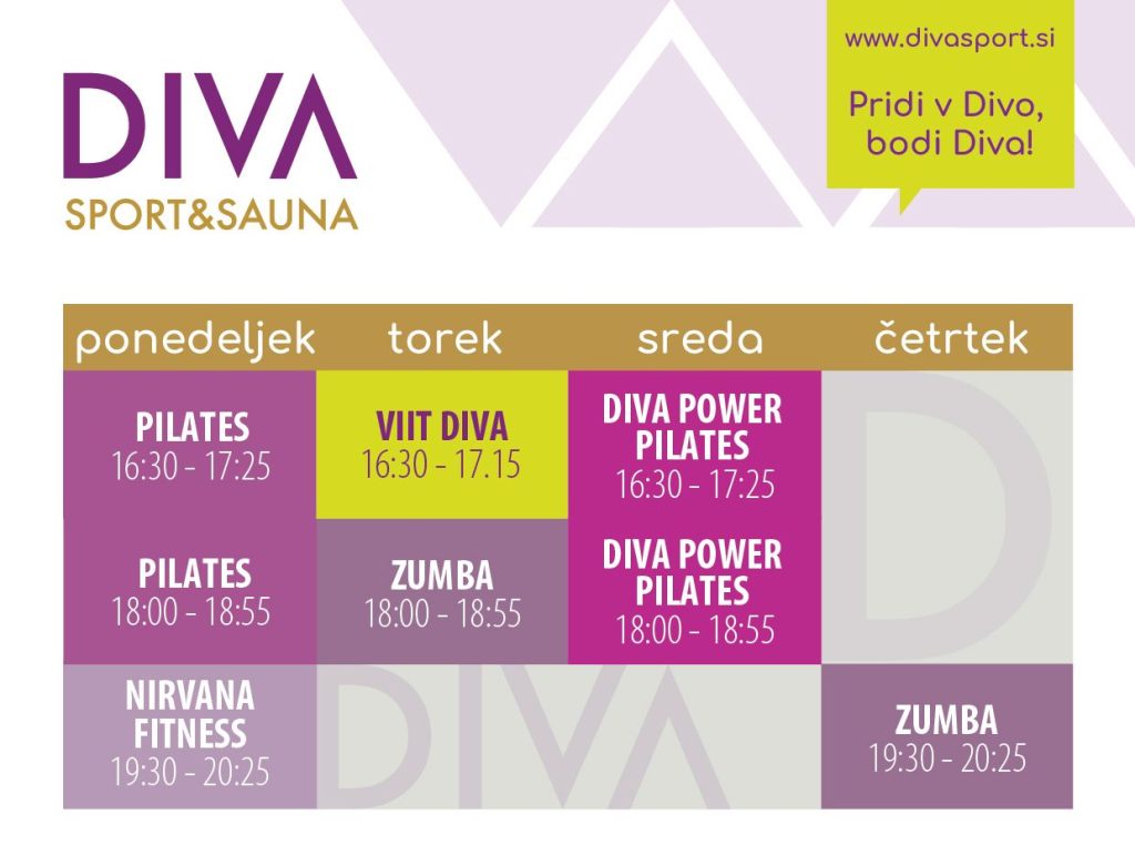 Urnik skupinskih vadb Divice pridno telovadimo že od septembra! Vedno se nam lahko pridružite. Nikoli ni prepozno za telovadbo, rekreacijo! Za obisk skupinske vadbe je potrebna predhodna rezervacija. Še se najdejo prosta mesta na posameznih vadbah, terminih. Pišite, pokličite! In ne pozabite: v družbi je lepše in lažje 🙂